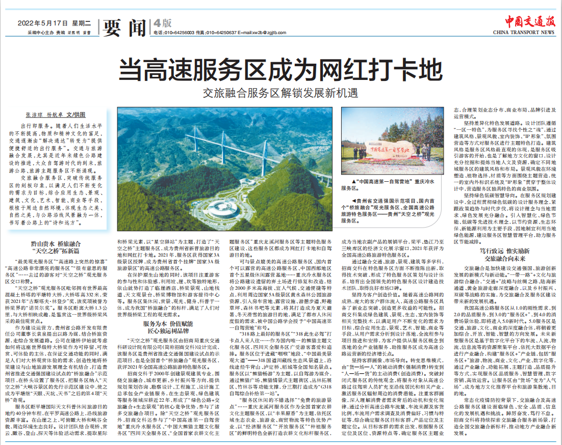 當(dāng)天的《中國交通報》還以《當(dāng)高速服務(wù)區(qū)成為網(wǎng)紅打卡地——交旅融合服務(wù)區(qū)解鎖發(fā)展新機(jī)遇》為題刊發(fā)專題報道,詳細(xì)介紹招商交科探索交旅融合發(fā)展之路。