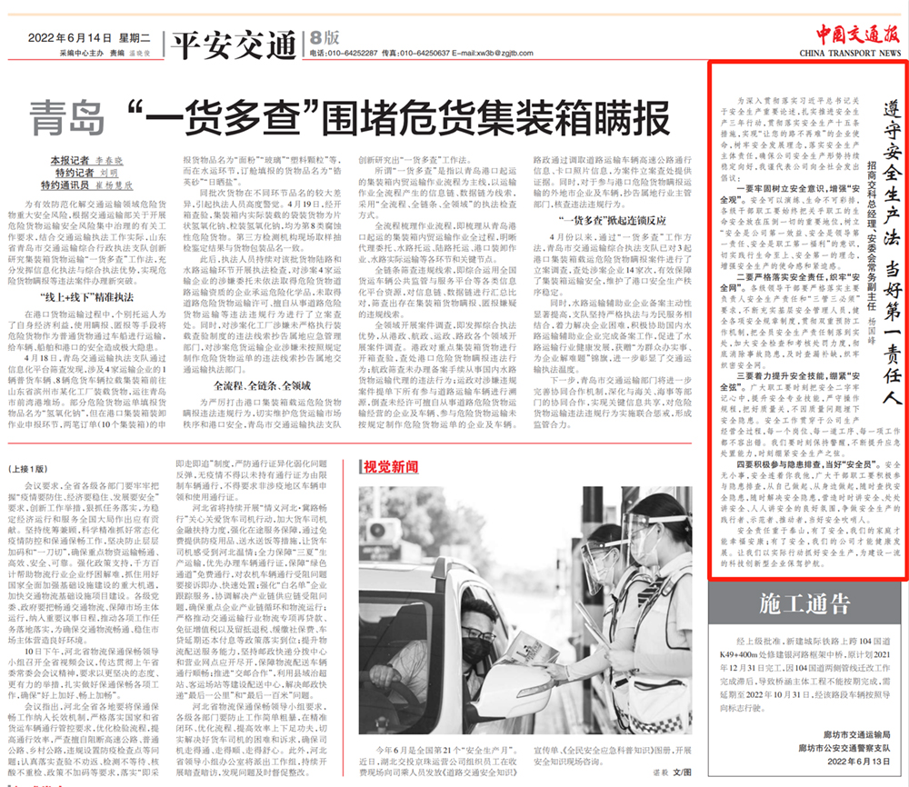 《中國交通報》刊發(fā)招商交科楊國峰安全生產(chǎn)倡議