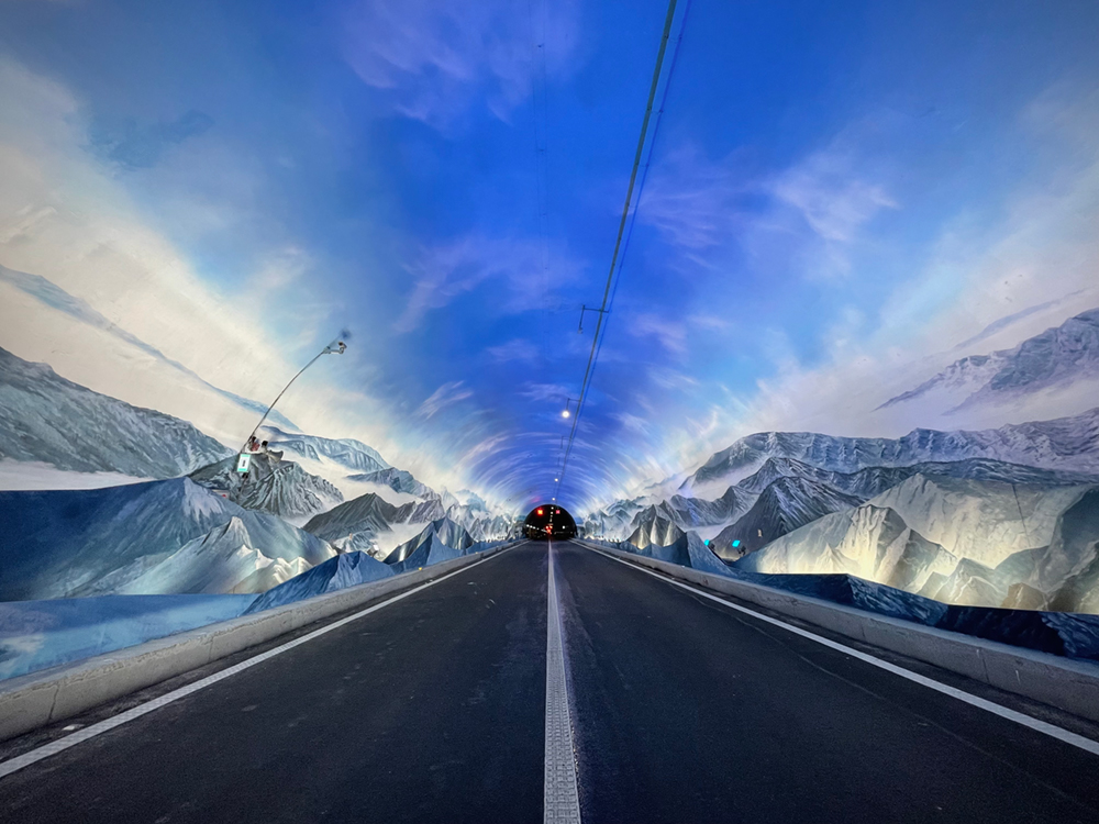 本次通車段共包含5個隧道,隧道洞門及洞內(nèi)景觀由景觀與建筑設(shè)計院設(shè)計并實施。城開特長隧道長達11.5公里,是重慶市目前最長的高速公路隧道,其中景觀拓寬段通過“聲”、“光”、“畫”的方式,打造出國內(nèi)首座純手繪“4D景觀”高速公路隧道。