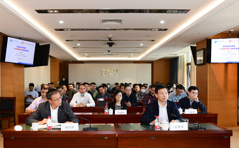 講座中,楊永斌院士以“橋梁動態(tài)感知——車輛掃描法最新進(jìn)展”為題,從當(dāng)前公路橋梁管理養(yǎng)護(hù)難、傳統(tǒng)檢測技術(shù)供給不足的背景出發(fā),提出車輛掃描法這一智慧管養(yǎng)系統(tǒng),并從車輛掃描法的理論簡介、力學(xué)模型和增效技術(shù)等三方面進(jìn)行分析講解。車輛掃描法集成了眾多先進(jìn)技術(shù),通過紀(jì)錄通過橋梁時的車體加速度時程響應(yīng),并從橋梁響應(yīng)頻譜找出橋梁頻率,用濾波器提取某一橋頻的分量響應(yīng),建立該橋頻的瞬時(當(dāng)下)振幅歷時,得出對應(yīng)于該橋頻的模態(tài)。講座中,橋梁加固院、招商路檢、物康公司的科研一線員工結(jié)合自身崗位實踐,與楊永斌院士進(jìn)行了深入的互動交流。