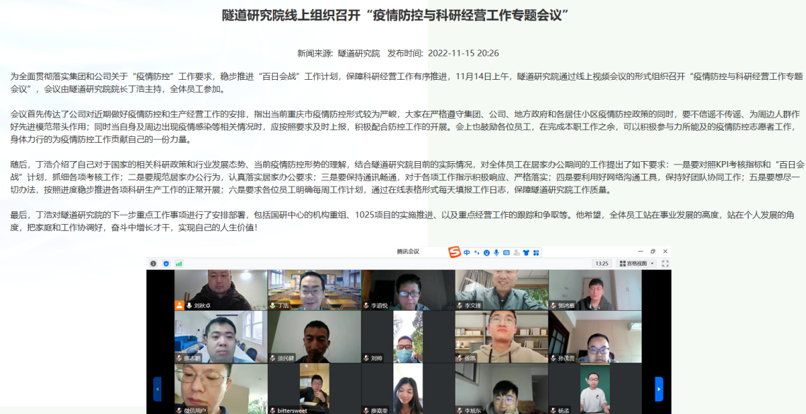 11月14日上午,在招商交科召開了防疫工作會(huì)議之后,隧道研究院隨即于線上組織召開了“疫情防控與科研經(jīng)營(yíng)工作專題會(huì)議”,傳達(dá)公司對(duì)近期做好疫情防控和生產(chǎn)經(jīng)營(yíng)工作的安排,要求大家嚴(yán)格遵守集團(tuán)、公司、地方政府和各居住小區(qū)的疫情防控政策,同時(shí)在居家辦公期間不放松、不懈怠、不躺平,要嚴(yán)格對(duì)照KPI考核指標(biāo)和“百日會(huì)戰(zhàn)”任務(wù)計(jì)劃,抓細(xì)各項(xiàng)考核工作;保持通訊暢通,對(duì)于各項(xiàng)工作指示積極響應(yīng)、嚴(yán)格落實(shí);利用好網(wǎng)絡(luò)溝通工具,保持好團(tuán)隊(duì)協(xié)同工作;想盡一切辦法,保障各項(xiàng)科研生產(chǎn)工作的正常開展。