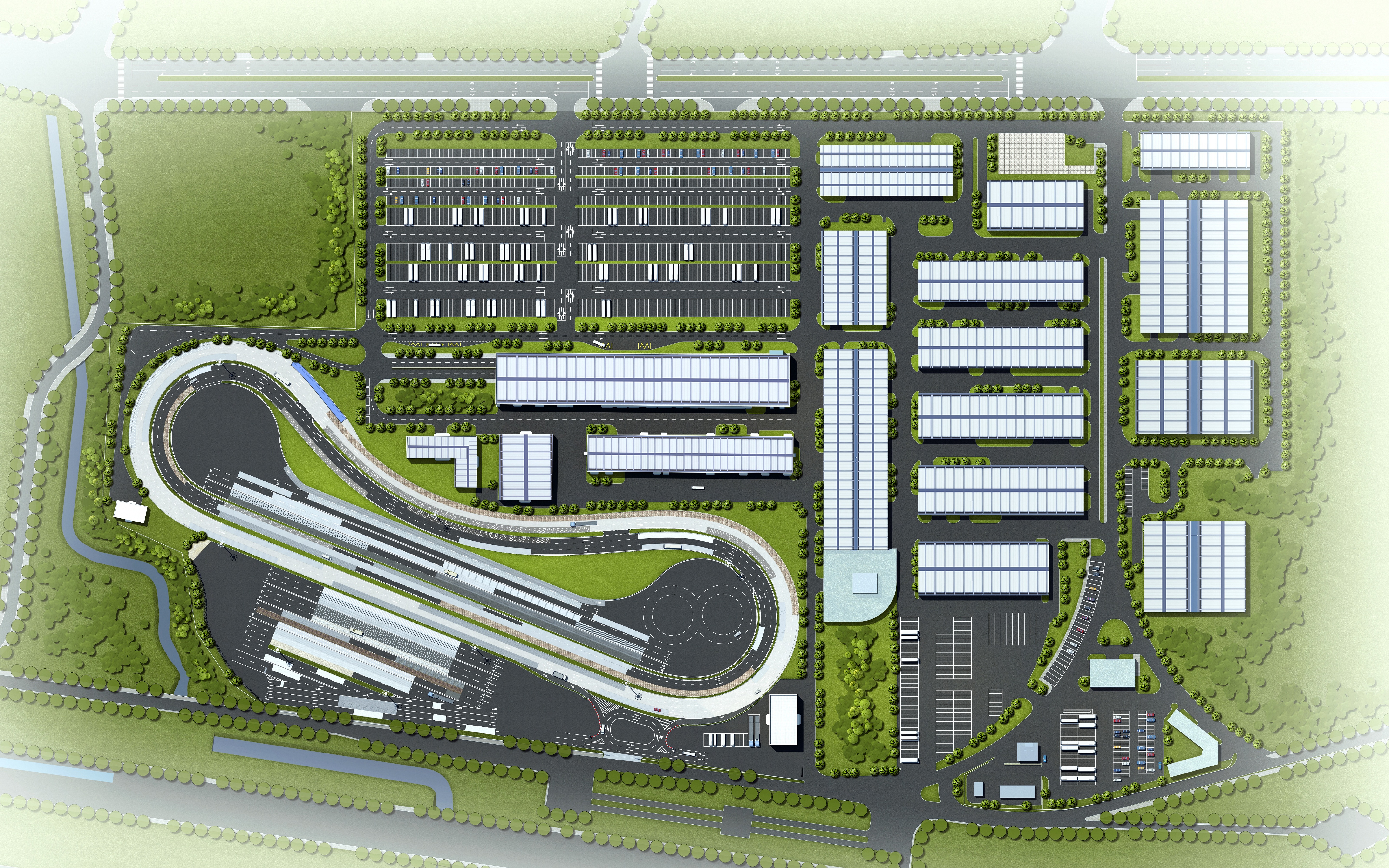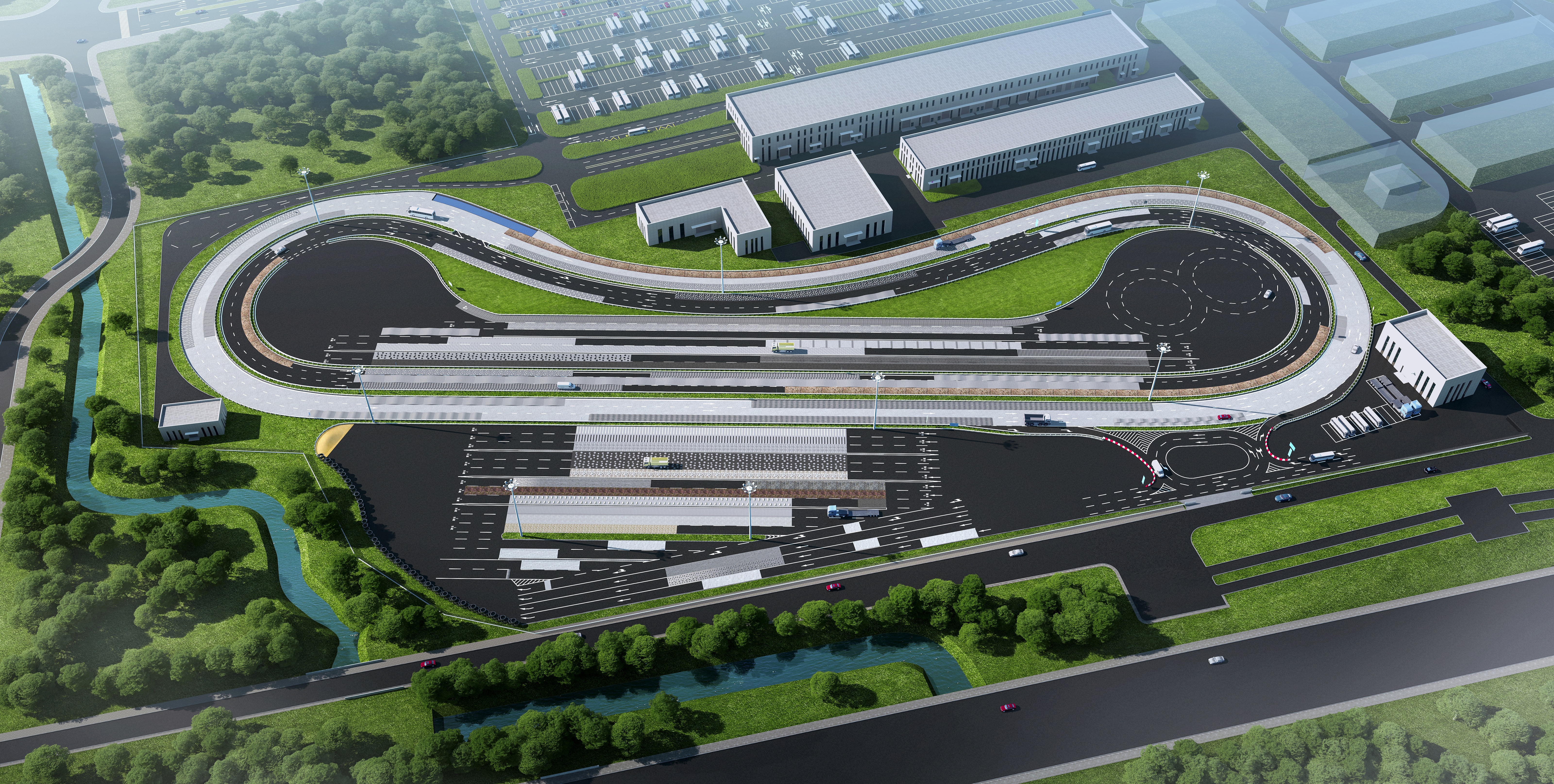 車(chē)檢院二期效果圖(鳥(niǎo)瞰圖) 新能源智能網(wǎng)聯(lián)汽車(chē)及智慧交通科技創(chuàng)新基地位于重慶市高新技術(shù)產(chǎn)業(yè)開(kāi)發(fā)區(qū)金鳳電子信息產(chǎn)業(yè)園,總占地總面積16.76萬(wàn)㎡,其中試驗(yàn)道路占地7.89萬(wàn)㎡,包括氣囊誤作用試驗(yàn)道路、NVH評(píng)價(jià)試驗(yàn)道路、強(qiáng)化耐久試驗(yàn)道路等3個(gè)區(qū)域,涉及比利時(shí)路、維也納路、坑洼路、扭曲路、搓板路、波形路、顛簸路、凸塊路、魚(yú)鱗坑、卵石路等50多種特種道路。項(xiàng)目建成后,將用于汽車(chē)和摩托車(chē)新產(chǎn)品研究開(kāi)發(fā)試驗(yàn)、標(biāo)準(zhǔn)驗(yàn)證及可靠性試驗(yàn)、相關(guān)法規(guī)試驗(yàn)等。