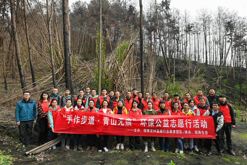一群平日里拿“筆桿子”的科研工作者,滿懷公益熱忱,此刻化身招商局志愿者,一路向前,從鄉(xiāng)村道路到崎嶇山路再到陡峭山壁,從山下住戶到山火第一條隔離帶再到山火核心地帶,經(jīng)過一個(gè)多小時(shí)徒步前行,最終抵達(dá)待修繕路段,眼前的一幕幕景象深深震撼著每一位志愿者,隨處可見的殘根斷枝,焦黑色的痕跡猙獰可怖。望著這片受傷的山林,志愿者們心中的信念更加堅(jiān)定了。