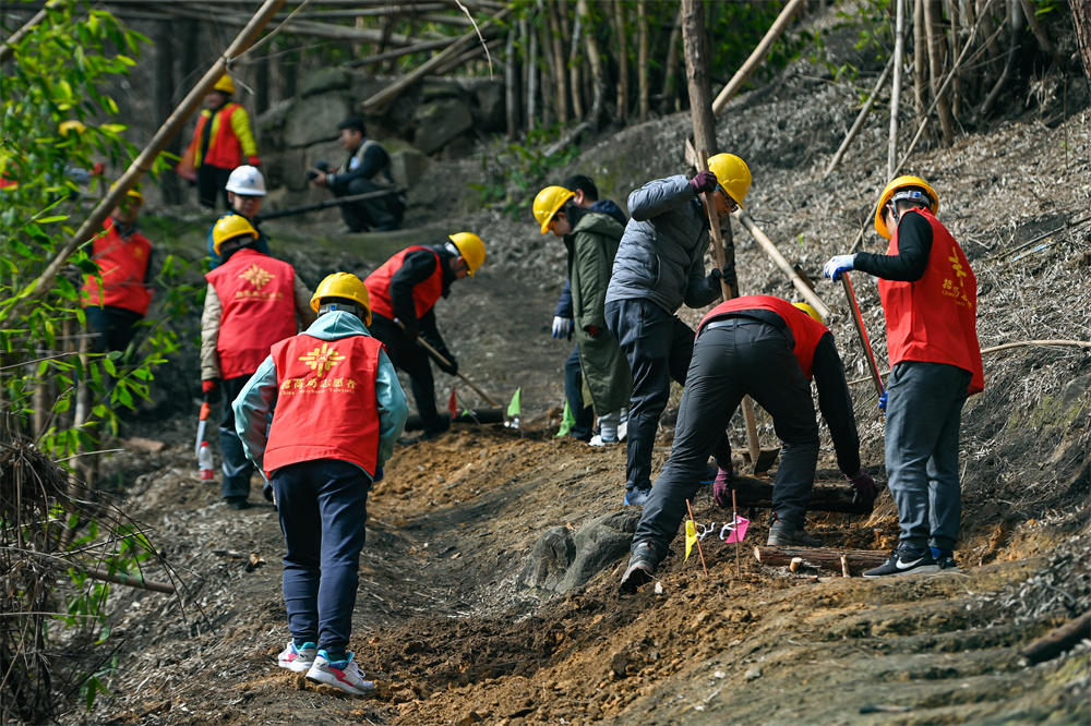 志愿者們結(jié)合自身科技環(huán)保工作專業(yè)優(yōu)勢(shì),分工協(xié)作、齊心協(xié)力,雙手緊握鋤頭、撬棍,生澀地鋤開每一塊焦土,艱難地撬開每一塊攔路之石。大家拿著沉重的斧子柴刀、鑿子鋼鋸,一刀一刀清理殘枝碎土,一錘錘鑿出青石板踏步石,一寸寸細(xì)土填縫抹平。男同志大汗淋漓,重活、累活搶著干,女同志巾幗不讓須眉,鋸木頭、做楔子,樣樣行。歷經(jīng)三個(gè)多小時(shí)的勞作,長約30米的步道修繕完成,遠(yuǎn)超計(jì)劃目標(biāo)長度。