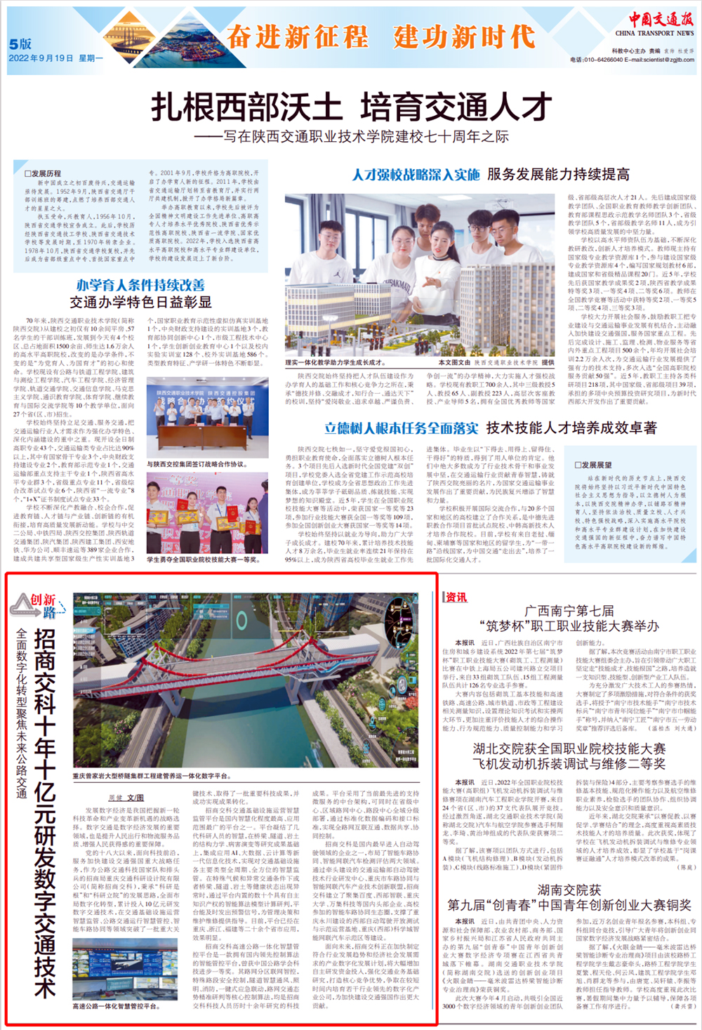 【編者按】2022年9月19日,《中國交通報(bào)》在第五版全文刊發(fā)了數(shù)字化中心文章《全面數(shù)字化轉(zhuǎn)型聚焦未來公路交通——招商交科十年十億元研發(fā)數(shù)字交通技術(shù)》。文章梳理了黨的十八大以來,公司在數(shù)字交通領(lǐng)域取得的系列成就,同時(shí)聚焦未來交通,公司將積極主動(dòng)的把握機(jī)遇,努力打造核心優(yōu)勢,服務(wù)交通強(qiáng)國重大戰(zhàn)略任務(wù)。現(xiàn)將全文轉(zhuǎn)載如下: