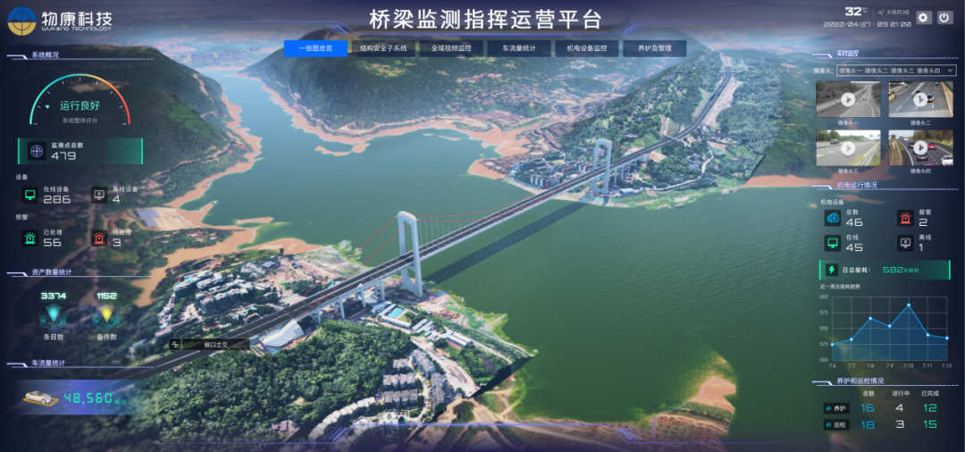 2023年1月,由招商交科主持設(shè)計的國內(nèi)最大跨度公軌兩用懸索橋——重慶郭家沱長江大橋正式通車,基于“1+1+1+N”結(jié)構(gòu)安全監(jiān)測體系研發(fā)而成的物康科技新一代數(shù)字化產(chǎn)品“大型基礎(chǔ)設(shè)施結(jié)構(gòu)安全智能監(jiān)測平臺”同步發(fā)布并投入使用。該平臺集成數(shù)字資產(chǎn)管理、結(jié)構(gòu)安全監(jiān)測、車流量監(jiān)測、全域視頻監(jiān)控、異常事件檢測、巡檢管養(yǎng)、應(yīng)急搶險7大功能;具備多場景、全生命周期管理,全要素、多尺度監(jiān)測,跨層級、多端交互,邊緣計算、邊云協(xié)同,數(shù)字孿生、虛實(shí)交互,多環(huán)境、多云部署6大能力,擁有1套精細(xì)化閉環(huán)運(yùn)營管理體系,可實(shí)現(xiàn)“一屏觀全域”“一網(wǎng)管全局”“一鍵統(tǒng)指揮”的效果,有效提升運(yùn)營管理智能化、智慧化水平,實(shí)現(xiàn)橋梁管養(yǎng)降本增效。