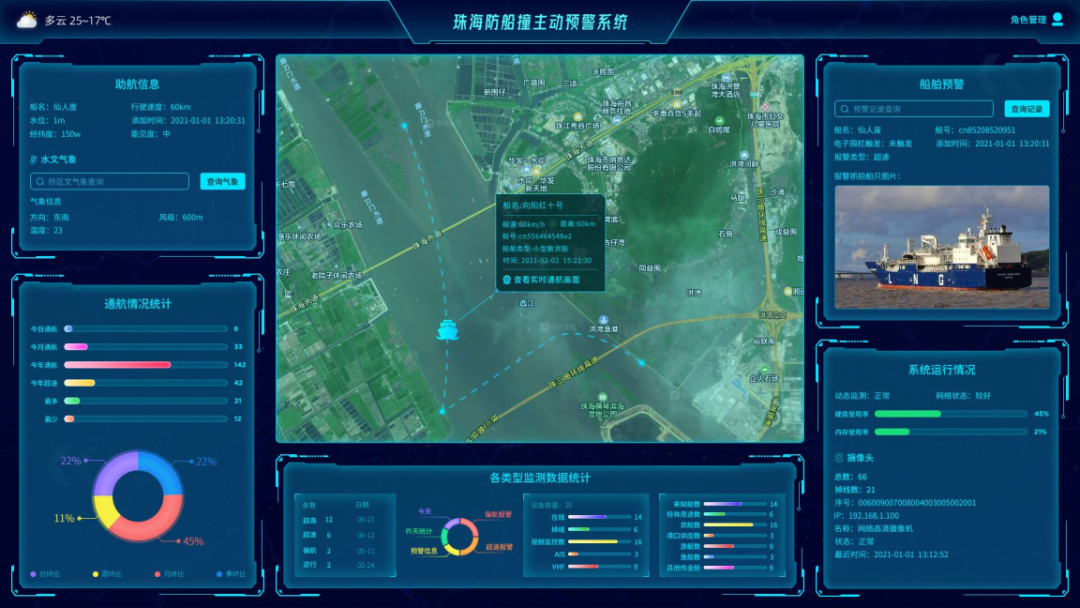 物康科技的主動防船撞系統(tǒng)通過自動識別系統(tǒng)(AIS)、熱成像、雷達(dá)、圖像識別等技術(shù)對涉水橋區(qū)的船舶通行高度、航速、航行軌跡及航向等進(jìn)行全天候?qū)崟r自動監(jiān)測,利用甚高頻、船用電笛、燈光等信號對橋區(qū)船舶進(jìn)行預(yù)報或預(yù)警以輔助船舶安全通過橋區(qū),降低船舶刮擦或碰撞橋梁的風(fēng)險。同時,該系統(tǒng)還可以對已發(fā)生的船舶刮擦或碰撞事件進(jìn)行及時取證和報警,還原事故過程。