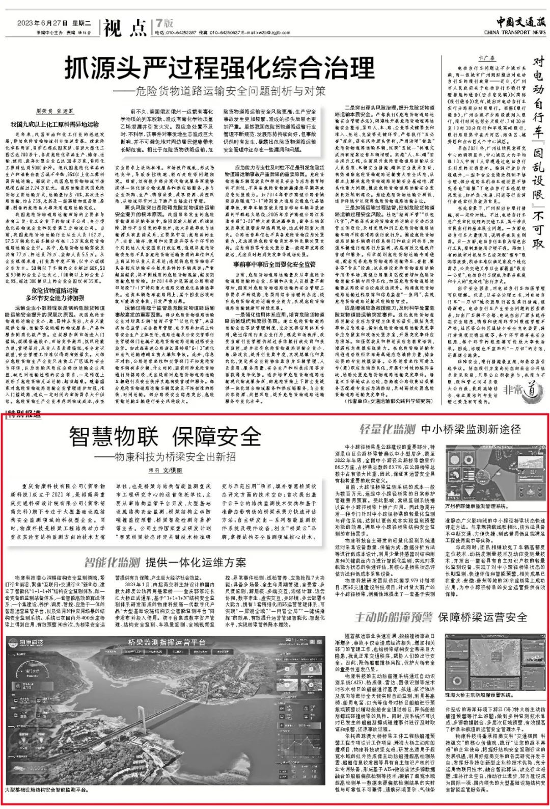 6月27日,在物康科技成立2周年之際,《中國交通報》在第七版和微信公眾號全文刊發(fā)了文章《智慧物聯(lián) 保障安全——物康科技為橋梁安全出新招》。文章詳細(xì)介紹了物康科技在結(jié)構(gòu)監(jiān)管平臺開發(fā)、大型基礎(chǔ)設(shè)施結(jié)構(gòu)安全監(jiān)測、橋梁結(jié)構(gòu)主動防碰撞監(jiān)控預(yù)警、橋梁智能檢測與養(yǎng)護(hù)等領(lǐng)域的技術(shù)和能力。現(xiàn)將全文轉(zhuǎn)載如下: