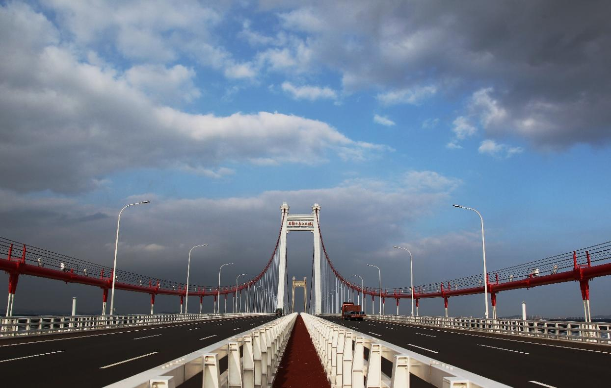馬鞍山長江公路大橋全長約36.274km,其中跨江主體工程長11.209km。大橋采用雙向6車道、設(shè)計車速100km/h高速公路技術(shù)標準。左汊主橋采用2×1080m三塔兩跨懸索橋,大橋主跨跨度突破千米,位列世界同類橋型第一,鋪裝面積達到7萬多平方米。大橋橋面鋪裝采用甲基丙烯酸樹脂防水粘結(jié)層+33mm澆注式瀝青混凝土+35mm高彈改性SMA10結(jié)構(gòu)。