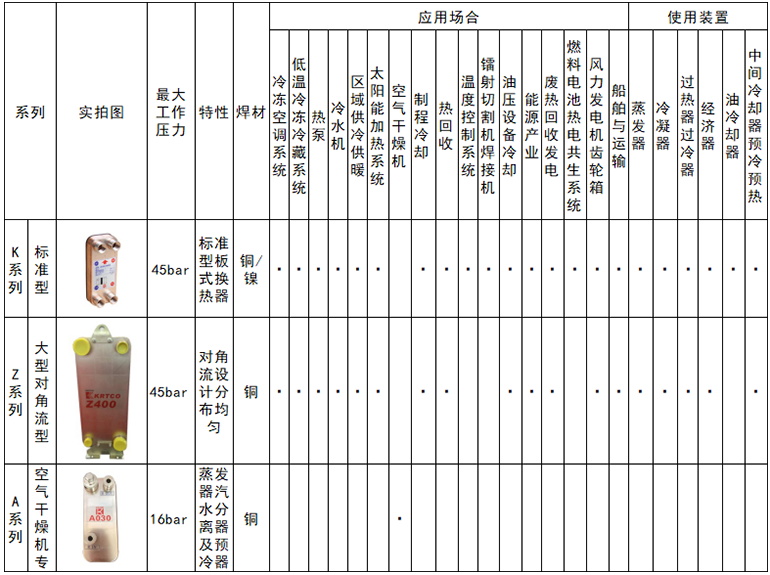 適用流體:各種冷媒、氨水(鎳焊型)、有機(jī)體溶液、水、油、各種鹵水溶液(乙二醇、酒精)